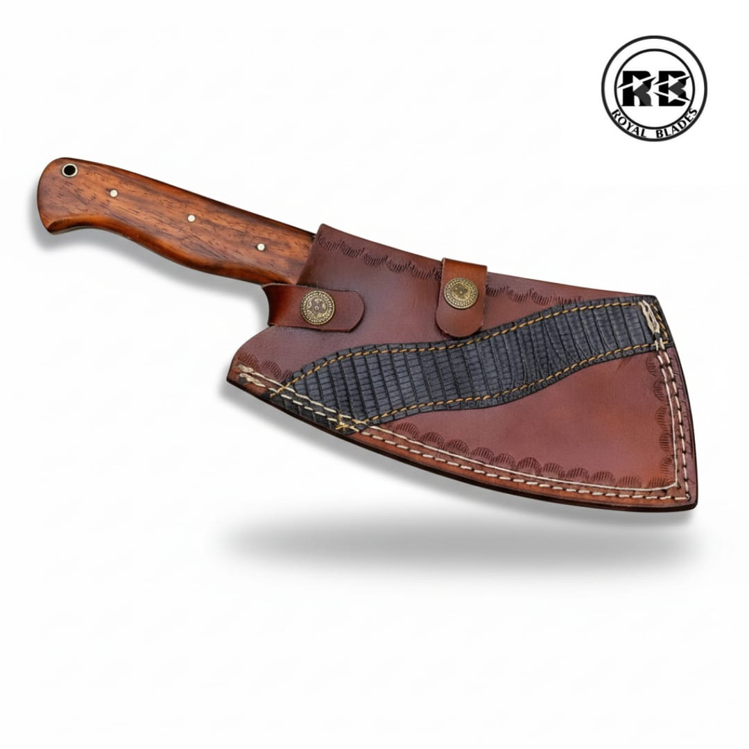 ​A powerful fusion of traditional craftsmanship and modern culinary performance. This 10-inch kitchen cleaver features a 5.5-inch Damascus steel blade, hand-forged to reveal a stunning layered pattern that signifies strength and surgical precision. Paired with an ergonomic 4.5-inch darkwood handle, this Royal Blades original is perfectly balanced for heavy-duty prep work, from breaking down proteins to slicing through dense vegetables. Complete with a handcrafted genuine leather sheath, it is a heritage-quality tool built for a lifetime of service