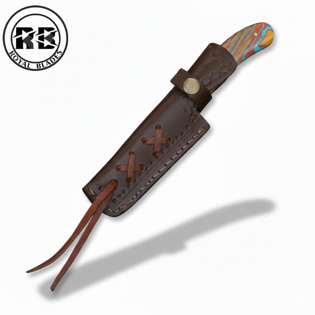 Stand out with the ultimate fusion of color and craftsmanship. This 10-inch handmade masterpiece features a breathtaking Copper Damascus blade paired with a multi colored Razan handle, creating a visual explosion of pattern and hue. Complete with a premium, cross-stitched leather sheath, this knife is a bold statement piece for any collector or outdoorsman who demands both style and substance.