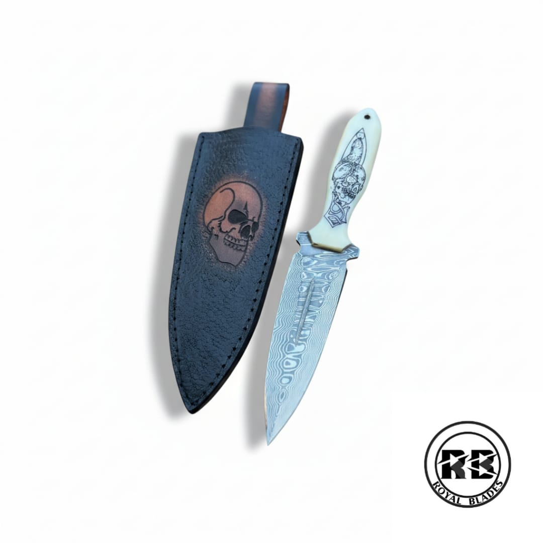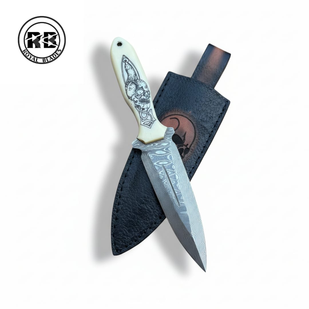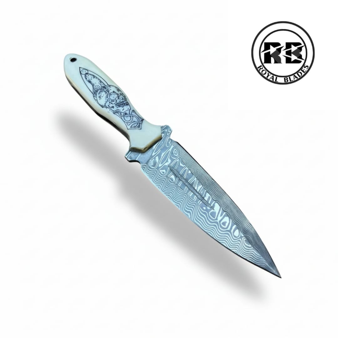 Discover the perfect balance between high-end performance and gothic artistry with this signature 10-inch dagger from Royal Blades. Designed for the discerning collector, this knife combines the ancient beauty of Damascus with modern laser-etching technology.