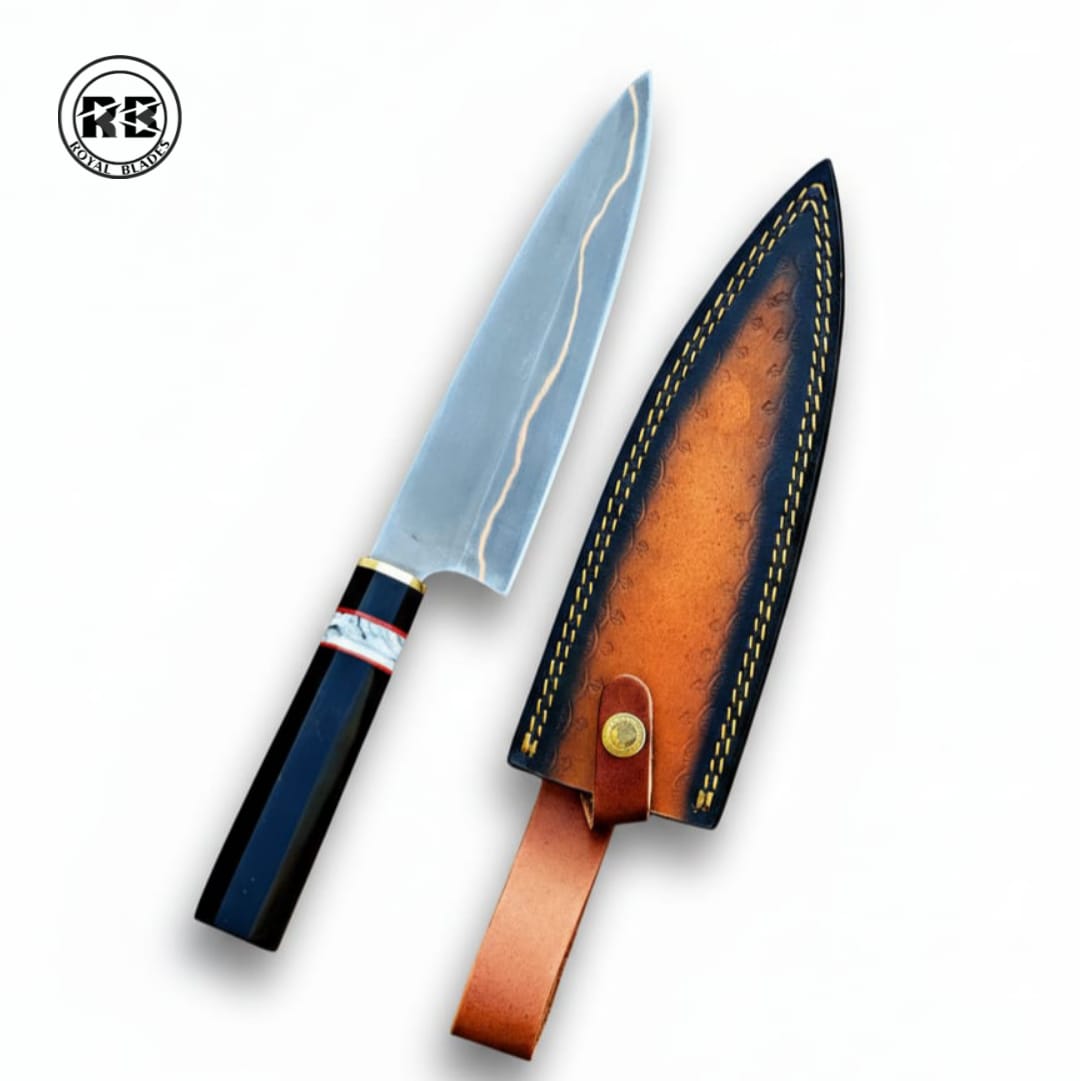 A breathtaking fusion of modern aesthetics and ancient forging mastery for the professional kitchen. This 11-inch artisan utility knife features a rare Copper Damascus steel blade with a precision 6-inch cutting edge. The standout feature is the handcrafted blue marble resin handle, accented by a white fiber spacer and a polished brass guard. This Royal Blades original is a unique masterpiece designed for elite culinary performance.