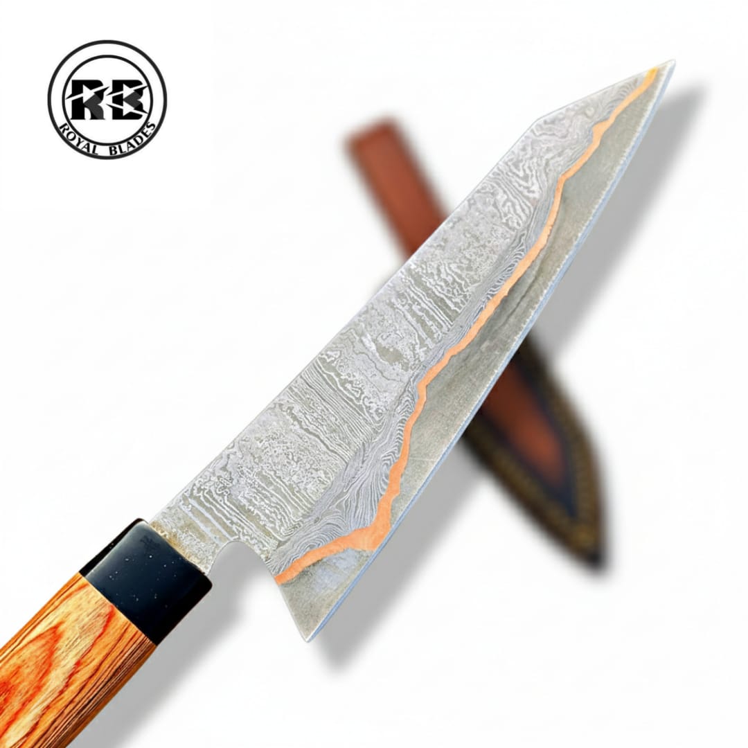 Like every Royal Blades original, this chef knife is a one-of-a-kind creation. The high-polish finish on the copper veins ensures they catch the light, making this knife a centerpiece of any culinary collection. Included is a genuine leather sheath for safe storage and transport, protecting the artisan edge from the elements.