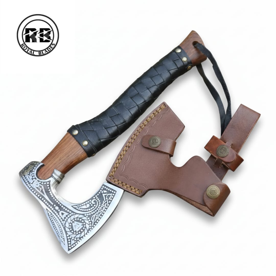 ​A strike of bold craftsmanship and ancient utility. This 14-inch Viking-style axe features a hand-forged carbon steel head with a precision 4-inch cutting edge. The rugged 12-inch Ash wood handle is meticulously finished with a striking two-tone colored leather wrap, offering superior hand-traction and a signature Royal Blades aesthetic. Complete with a custom-fitted leather sheath, it is a definitive tool for the modern adventurer.