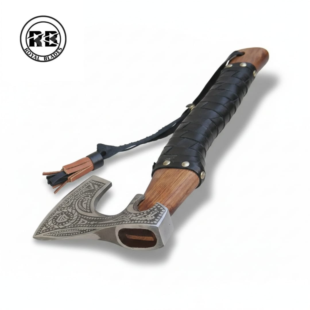 The Royal Blades 14″ Hand-Forged Carbon Steel Viking Axe with Harlequin Leather Grip