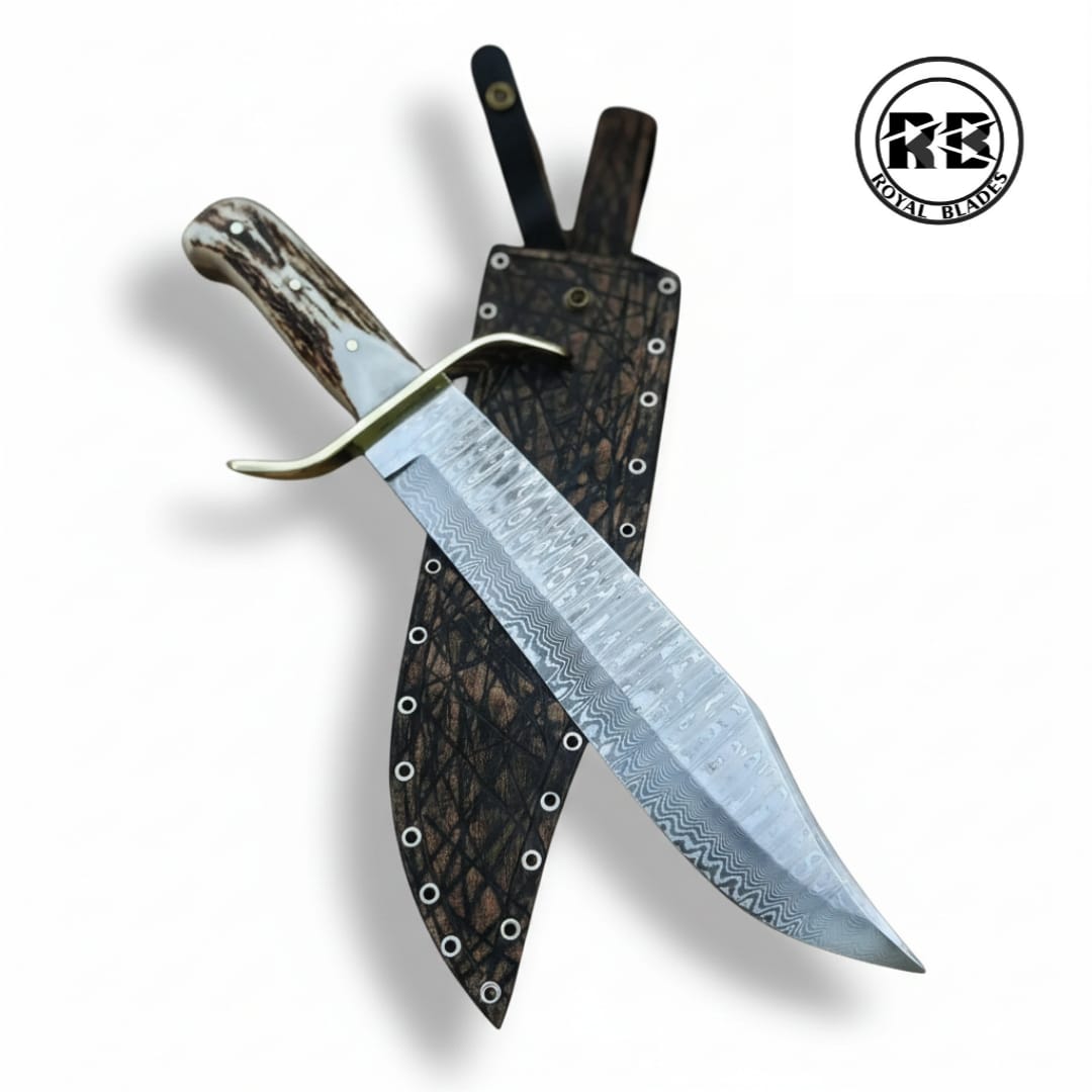 Command the field with a massive display of power and elegance. This professional-grade 15.15-inch Bowie knife features a sprawling 10-inch Stainless Steel Damascus blade, offering a breathtaking raindrop pattern with a rust-resistant finish. Paired with a premium natural Stag Horn handle and a solid brass guard, this Royal Blades original is the ultimate heirloom for the serious collector.