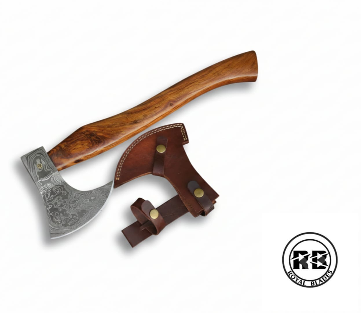 Every Royal Blades original deserves premium protection. This axe includes a handmade genuine leather sheath designed to secure the Damascus bit. Featuring reinforced stitching and heavy-duty brass snaps, the sheath ensures your 512-layer steel stays protected from the elements while providing a classic, rugged aesthetic for belt or pack carry.