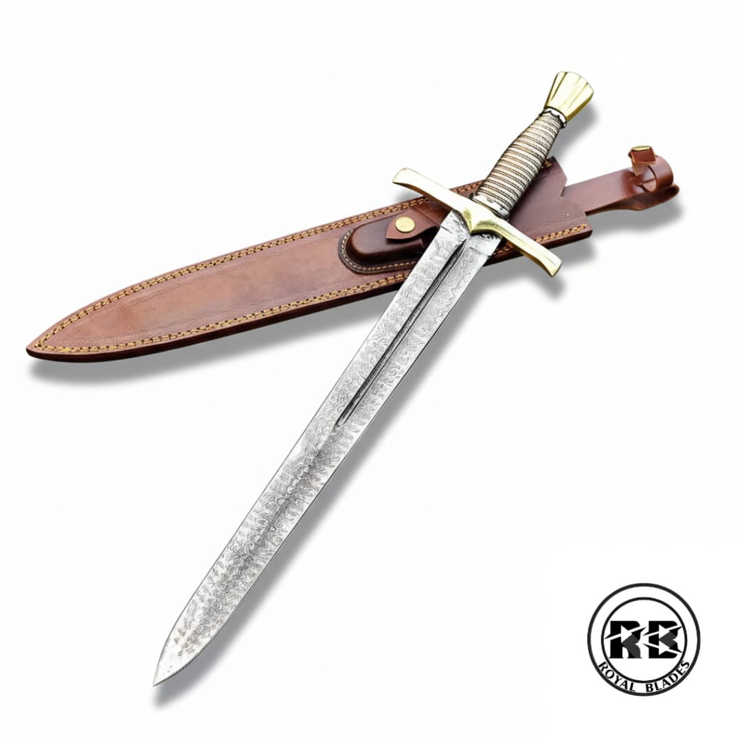A breathtaking fusion of ancient metallurgy and refined artistry. This 22-inch dagger features a robust 16-inch Damascus steel blade, hand-forged from a high-performance blend of 15N20 and 1095 high-carbon steel. Anchored by a durable brass guard and pommel and a striking multi-color wire-wrapped handle, this Royal Blades original offers a secure grip and a commanding presence. Complete with a handcrafted genuine leather sheath, it is a definitive piece for the serious collector.