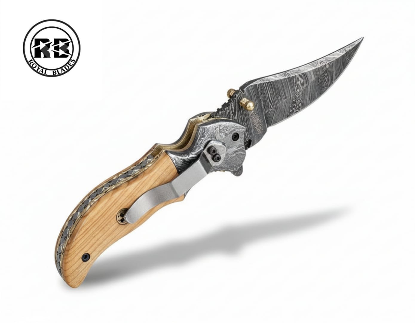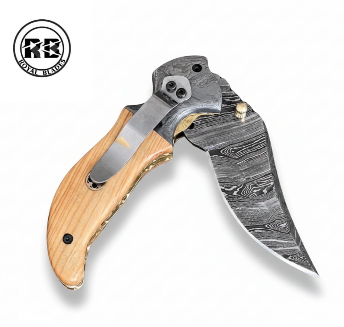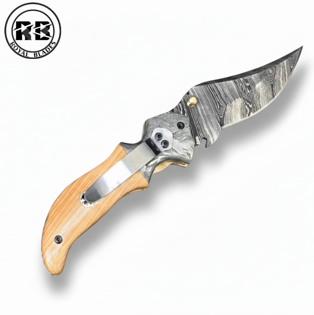 A perfect blend of rustic elegance and modern utility. This 7.5-inch handmade folding knife features a razor-sharp 3-inch Damascus steel blade hand-forged into a stunning, high-contrast pattern. Paired with a smooth, ergonomic natural wood handle and an integrated steel pocket clip, this Royal Blades original is the ultimate companion for everyday carry.