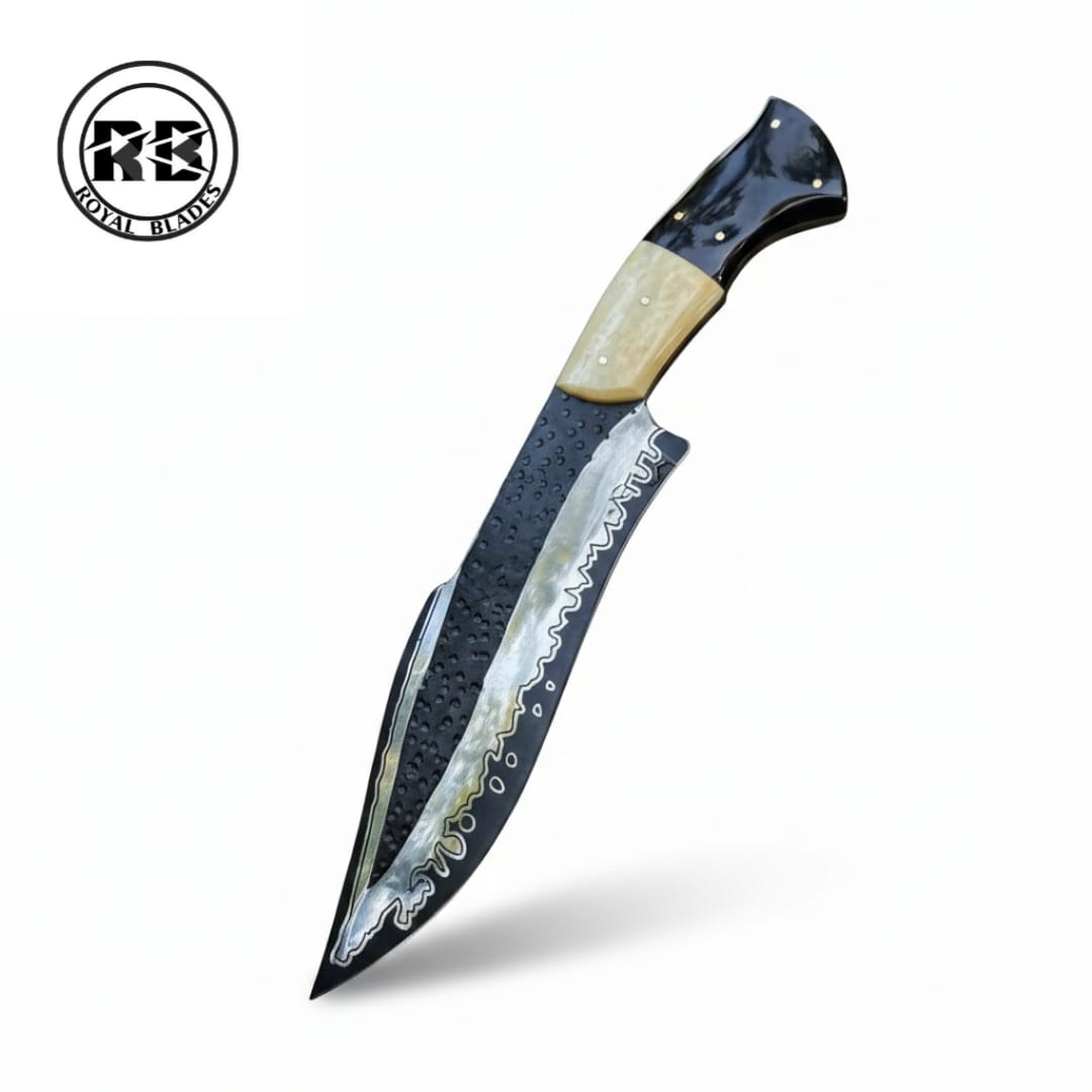 Experience the cutting-edge of bladesmithing with this 12-inch masterpiece. Featuring a specialized Cumai blade a high-performance core of D2 steel clad in high carbon steel this knife offers unparalleled edge retention and a stunning visual contrast. Paired with a sophisticated Camel Bone and Bull Horn handle and a handcrafted leather sheath, this Royal Blades original is built for elite performance and style.
