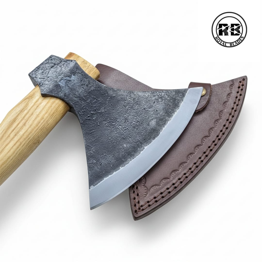 ​A heavy-duty tool built for the professional woodsman. This 25.8-inch hand-forged axe features a high-impact 1040 carbon steel head with a precision-honed 7-inch cutting edge. Anchored by a rugged Ash wood shaft and a refined Rosewood handle finish, this Royal Blades original offers a perfect balance of raw power and ergonomic control. Complete with a custom-fitted leather sheath, it is ready for the most demanding field tasks.